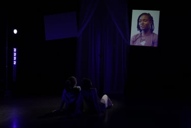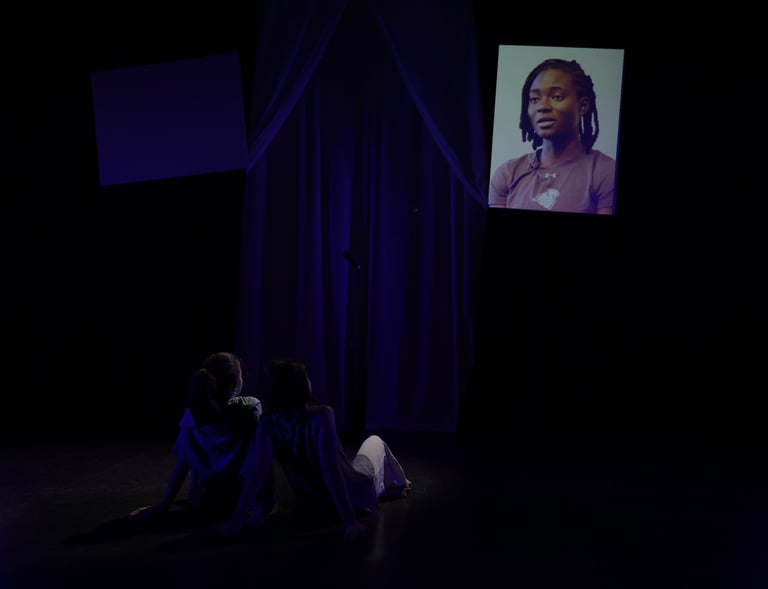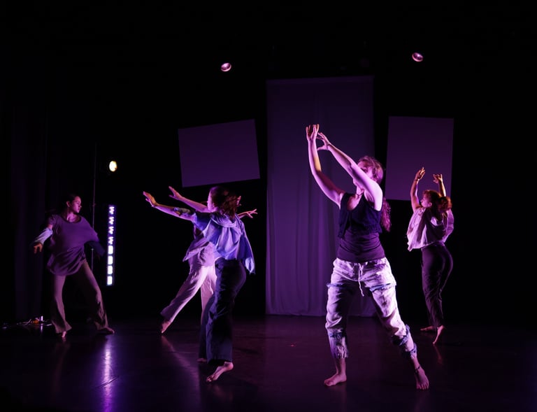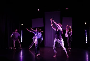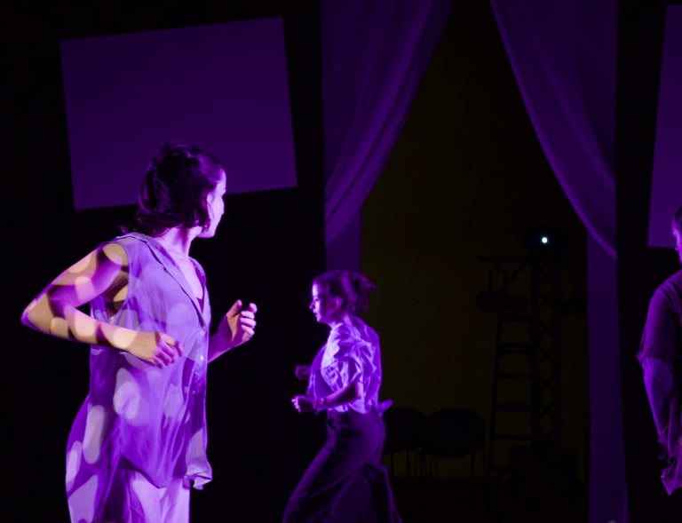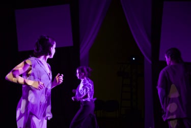 The choreography of SYMPHYSIS, crafted by Dani Crosta, is a powerful visual and emotional anchor that brings the stories of the interviewees to life. Dani's movement design splits the performers into two distinct yet interconnected groups: a soloist on the nostalgia/familiarity side, and an ensemble that flows fluidly between both sides of the stage. This deliberate separation reinforces the tension between holding onto one’s roots and embracing new beginnings. The soloist’s movements are intimate and reflective, embodying the weight of memory and tradition, while the ensemble’s choreography is dynamic and transitional, mirroring the journey of adaptation and transformation. Through this physicalization of the immigrant experience, Dani's choreography not only amplifies the emotional depth of the interviews but also creates a visceral connection between the performers, the space, and the audience.