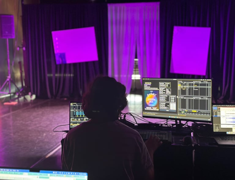 The sensory experience of SYMPHYSIS is elevated by its meticulously crafted sound and lighting design, co-created by Ethan Chin, Jay Sexton (lighting), and Willow Lopez (sound). Each environment is individually tailored to immerse the audience in the duality of the performance. The hope and opportunity side comes alive with dynamic, forward-moving lighting that pulses with energy, paired with a soundscape that crescendos with ambition and possibility. In contrast, the nostalgia and familiarity side is bathed in warm, subdued lighting that evokes a sense of comfort and reflection, accompanied by a soundscape rich with echoes of tradition and memory. Together, these designs create two distinct worlds that are both visually and sonically immersive, guiding the audience through the emotional and thematic contrasts at the heart of the show.